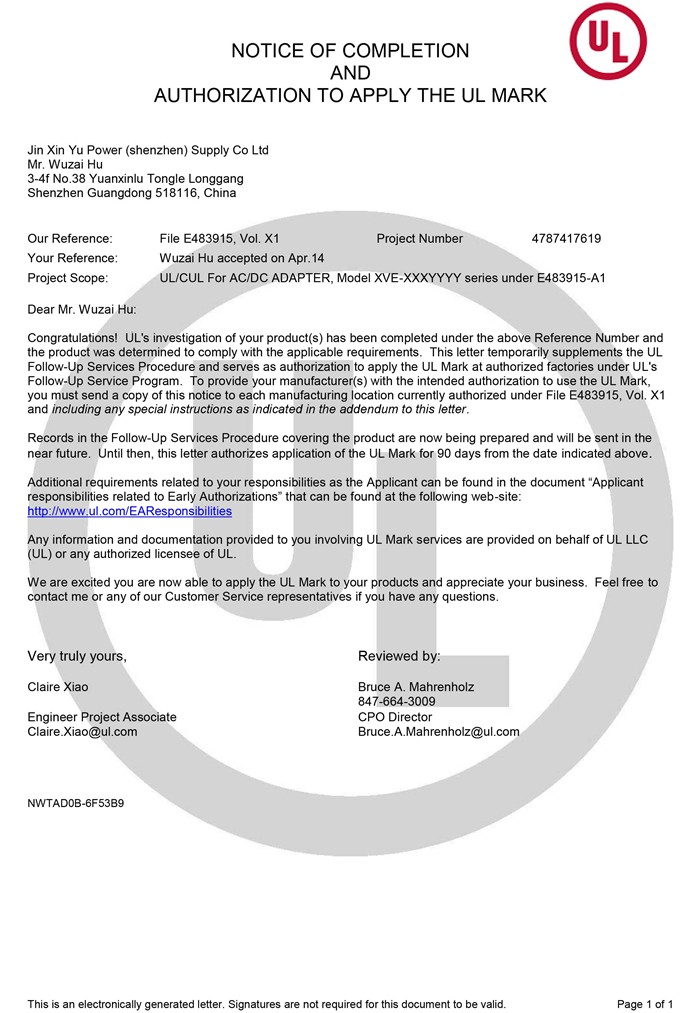» 企業(yè)榮譽(yù) » UL證書(shū)