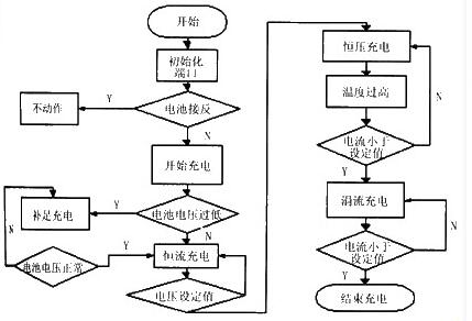 上電后,單片機(jī)首先檢查電池是否接反,電池電壓是否因?yàn)殡姸^(guò)低,如果電壓過(guò)低,先使用小電流給電池充電一間,使電壓達(dá)到三階段充電常水平在開(kāi)始充電,如果電常則直接進(jìn)入正常充電階首先是恒流充電階段,充電小于0.5 C,一般取0.1 C,電壓會(huì)緩慢的上升,當(dāng)電壓到一定階段(本例中采用電60V)改為恒壓充電,此時(shí)隨電過(guò)程的進(jìn)行電池內(nèi)阻會(huì)逐升,充電電流會(huì)隨著內(nèi)阻的而減小,當(dāng)單片機(jī)檢測(cè)電流減小到一定的值(小于恒流充電值的1/1 0),立即轉(zhuǎn)入涓流充電階段,充電電流一般取0.3C,在此階段電池電壓會(huì)減小,當(dāng)充電電流小于0.0 1 C時(shí)即可認(rèn)為電池已充滿,單片機(jī)會(huì)自動(dòng)將電池從充電電路中切除。在恒壓階段如果單片機(jī)檢測(cè)到電池溫度高于45度則自動(dòng)轉(zhuǎn)入第三階段,待溫度下降后再轉(zhuǎn)入第二階段。充滿后通過(guò)單片機(jī)關(guān)斷繼電器,停止充電.。