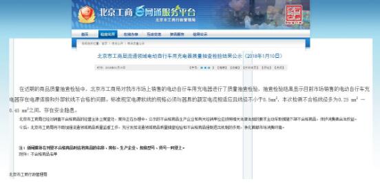 2018年1月10日,北京市工商局官網(wǎng)發(fā)布流通領(lǐng)域電動自行車用充電器質(zhì)量抽查檢驗結(jié)果。