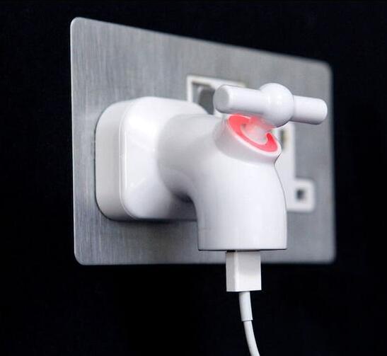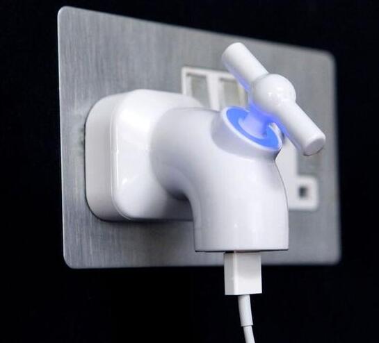 這款充電器在外觀方面居然是一個(gè)水龍頭的造型,看起來非常奇葩。在水龍頭上,一端為電源插頭,另一端為USB接口。在使用的時(shí)候,將電源插頭插在插座中,然后再把手機(jī)和水龍頭的USB接口連接,然后就可以為手機(jī)或者Pad等數(shù)碼設(shè)備進(jìn)行充電即可。