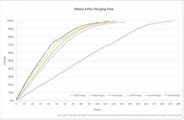 國(guó)外網(wǎng)友Dan Loewenherz,用iPhone 8 Plus做了一個(gè)充電器測(cè)試,從圖表上看來(lái),如果用戶使用10W的充電器,絕對(duì)是性價(jià)比最高。