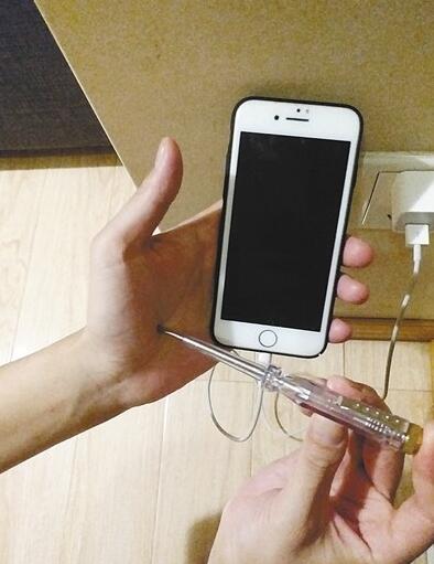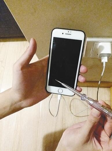 實驗道具:金屬外殼手機幾部、對應的充電器、一支家常電筆(用于測試100V~500V交流電)實驗過程:按照網(wǎng)上視頻的方法,記者首先將一部手機充上電,隨后用手握住手機,再用電筆測試,手機機身和手上是否帶電。