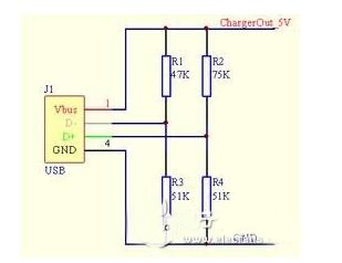 這是蘋果手機(jī)的典型識別電路,用的是電阻方式,通過檢測D+ D-腳上面的電壓值來決定設(shè)備處于何種充電電流下,決定設(shè)備能不能充電。