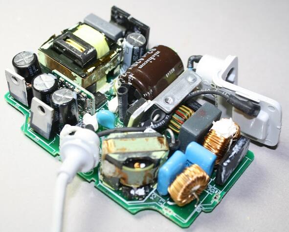 這看起來(lái)很奇怪,我發(fā)現(xiàn)打開(kāi)一個(gè)充電器最好的方法是敲擊木鑿周?chē)目p隙。隨著外殼打開(kāi),就可以看到適配器的金屬散熱器,散熱器可以幫助冷卻適配器內(nèi)的大功率半導(dǎo)體。適配器另一邊則顯示了電路板,底部為電源輸出,一些微型的零部件也可以看得見(jiàn),但大多數(shù)的電路還是被金屬散熱器覆蓋著,被黃色的絕緣膠帶固定著。