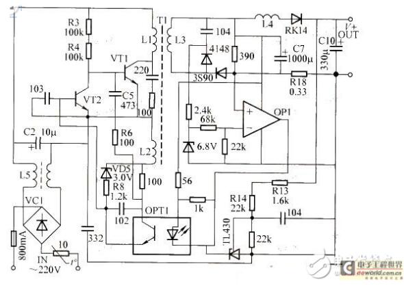 電路工作原理:由圖可知,VC1、L5以及C2等組成市電輸人整流濾波電路,C2兩端產(chǎn)生約300V的直流高壓。VT1、VT2、L1、L2等組成自激式振蕩電路,R3、R4提供啟動(dòng)偏置電流,使VT1加電時(shí)即導(dǎo)通。當(dāng)主回路L1中有電流流過(guò)時(shí),L2上產(chǎn)生感應(yīng)電動(dòng)勢(shì),當(dāng)其峰值超過(guò)3V時(shí),VD5被擊穿,通過(guò)R8向VT2提供偏流,使VT2飽和導(dǎo)通,VT1因偏置電壓被短路而關(guān)斷。當(dāng)L1中電流關(guān)斷時(shí),L2感應(yīng)電動(dòng)勢(shì)的極性反相,經(jīng)VD5、R8加反向偏壓于VT2基極,VT2轉(zhuǎn)變?yōu)榻刂範(fàn)顟B(tài),VT1經(jīng)R3、R4提供的偏置電流重新導(dǎo)通。如此循環(huán)往復(fù),形成間歇自激振蕩。C5、R6用以改善振蕩波形,光電耦合器OPT1用以調(diào)控振蕩器脈沖寬度。