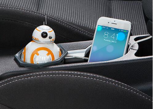 這次所推出的「BB-8」車用充電器的設計在下半部的地方是采用圓柱體的外觀,剛好能讓駕駛將這個車用充電器安置在飲料杯架的地方,百分之百的符合使用者所需的設計!值得一提的是,這次所推出「BB-8」造型的車用充電器可以表現(xiàn)出與電影中BB-8所運行方式一樣的情況,上半部半圓形的機體可以左右擺動并且360度旋轉(zhuǎn),更是有兩個USB插槽,有興趣的不要錯過啦。