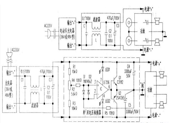 用充電器作電源,只需挑選充電器的輸出電壓(36與48V型)接近所采用功放的電源電壓值,按上圖方式連接使用即可。圖中除充電器與功放外,兩者間加入的L、C1~C3等元件環(huán)節(jié)。