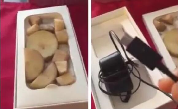 她在確認手機一切正常之后,就買下了這部手機。但是回家后她打開包裝卻發(fā)現(xiàn),盒子里沒有iPhone 6,只有11塊已經(jīng)變質的土豆……